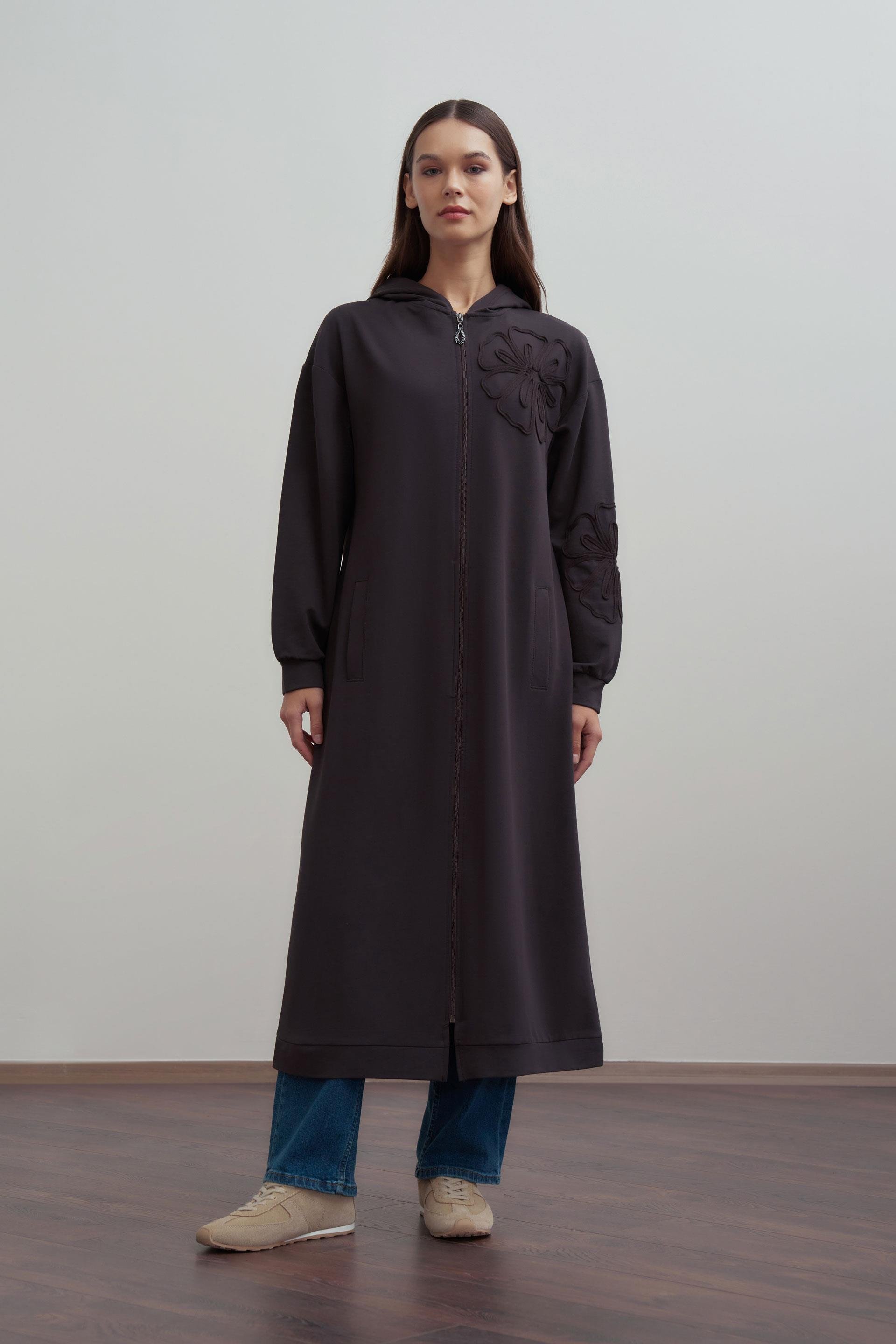 Acı Kahve-Pamuklu Nakışlı Fermuarlı Sweat Hırka