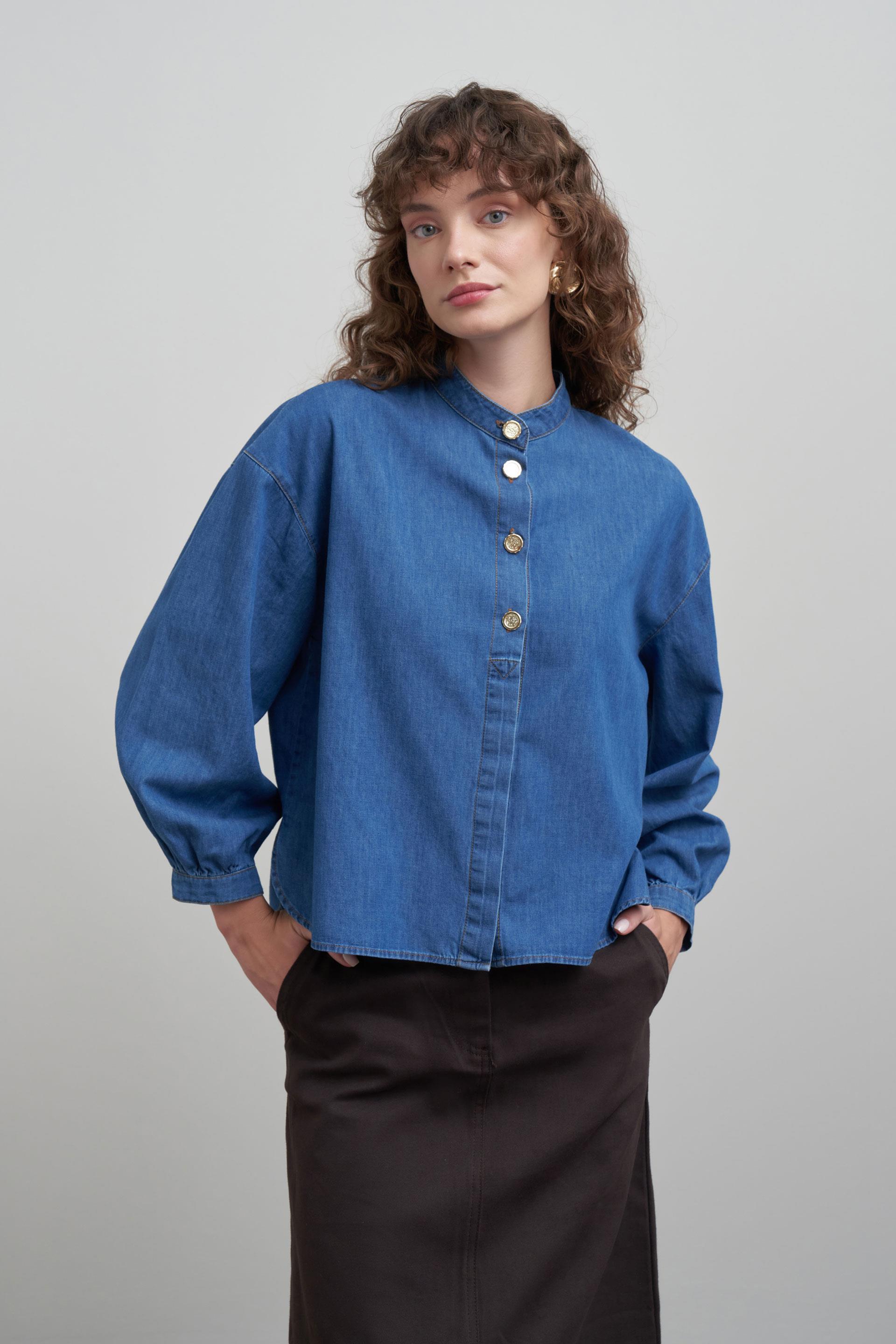 Açık Mavi-Gold Dügmeli Denim Gömlek