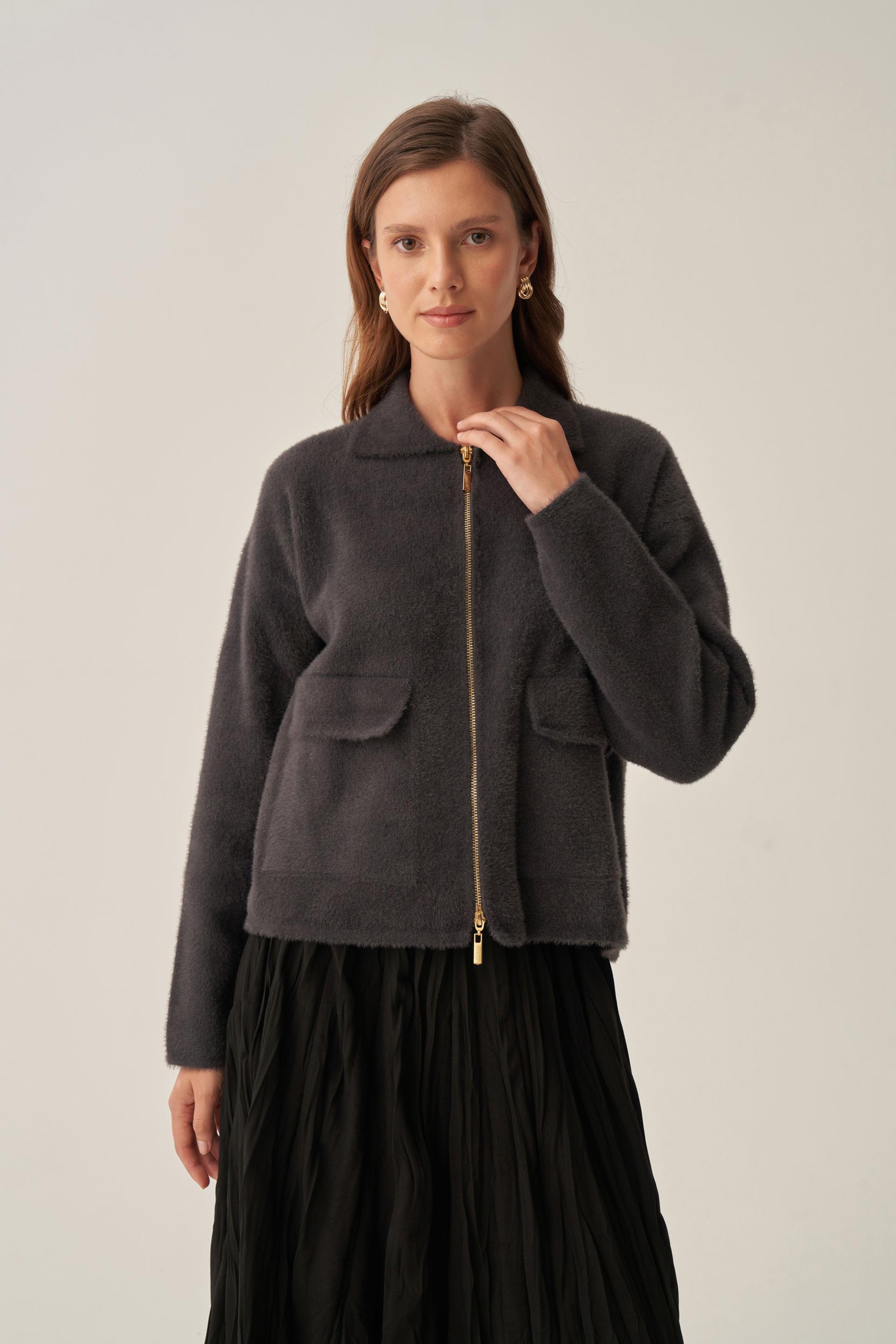 Antrasit-Kapak Cepli Fermuarlı Peluş Hırka
