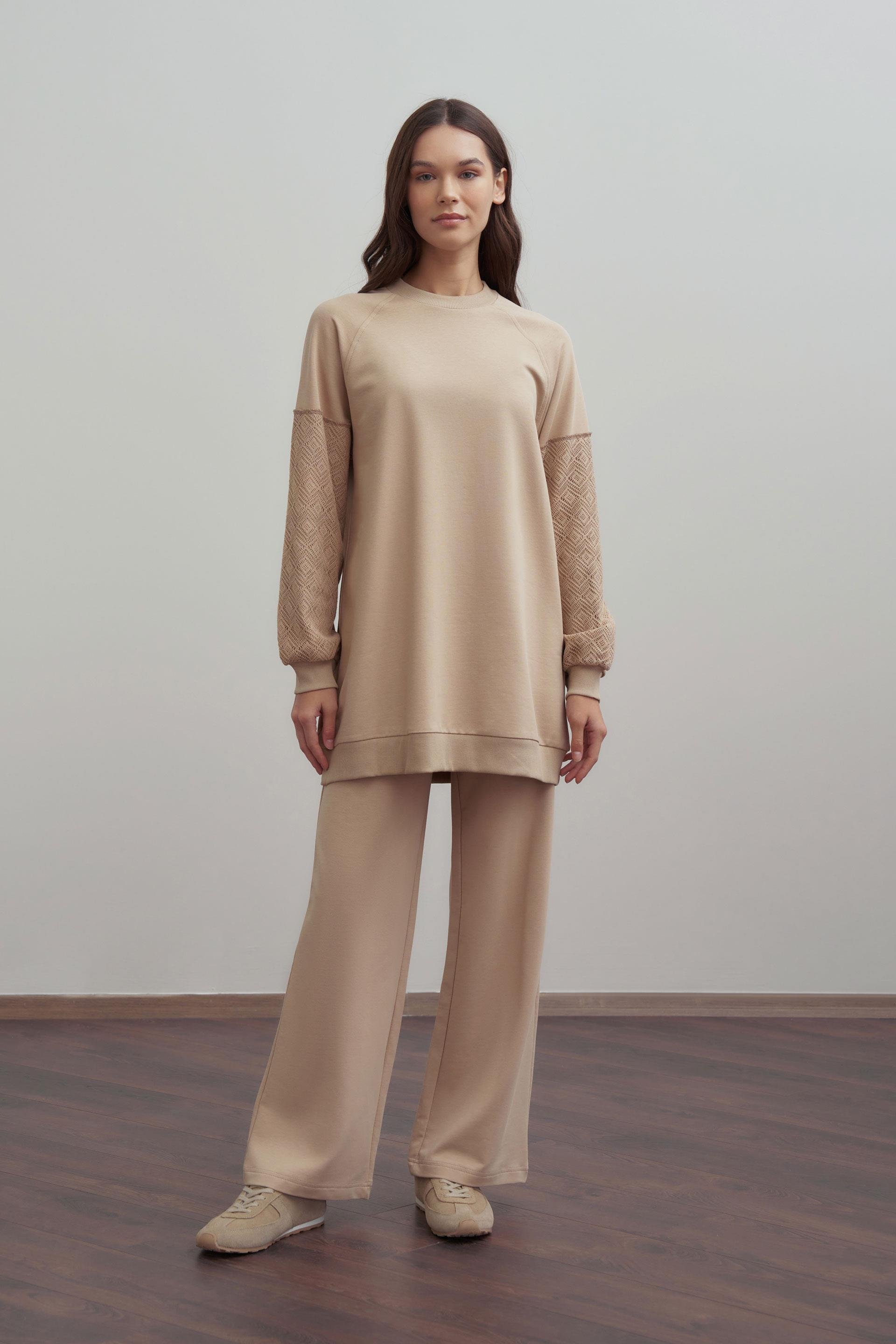 Bej-Pamuklu Dantel Garnili Eşofman Takımı