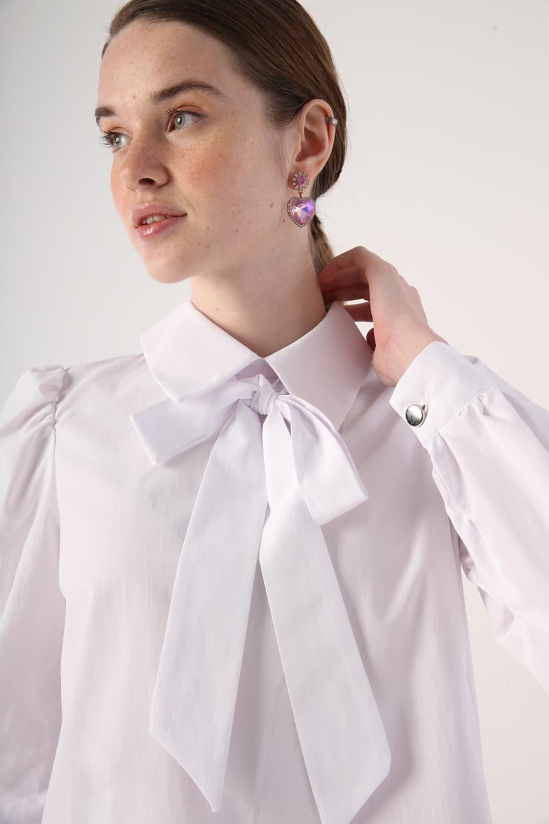Beyaz-Yakası Fular Detaylı Kolu Büzgülü Tunik