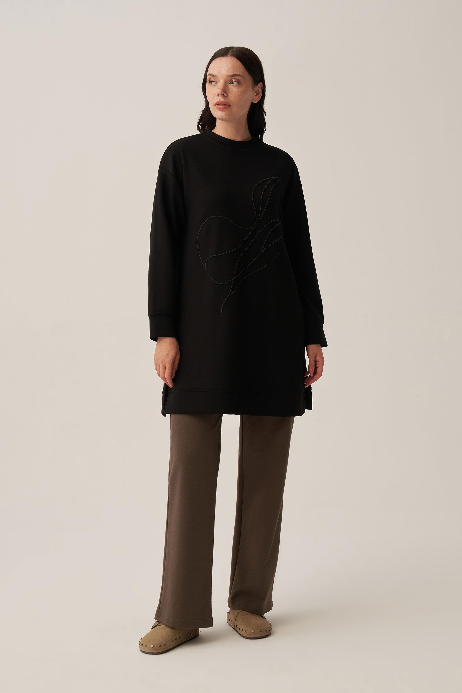 Siyah-Yumuşak Dokulu Nakışlı  Sweatshirt