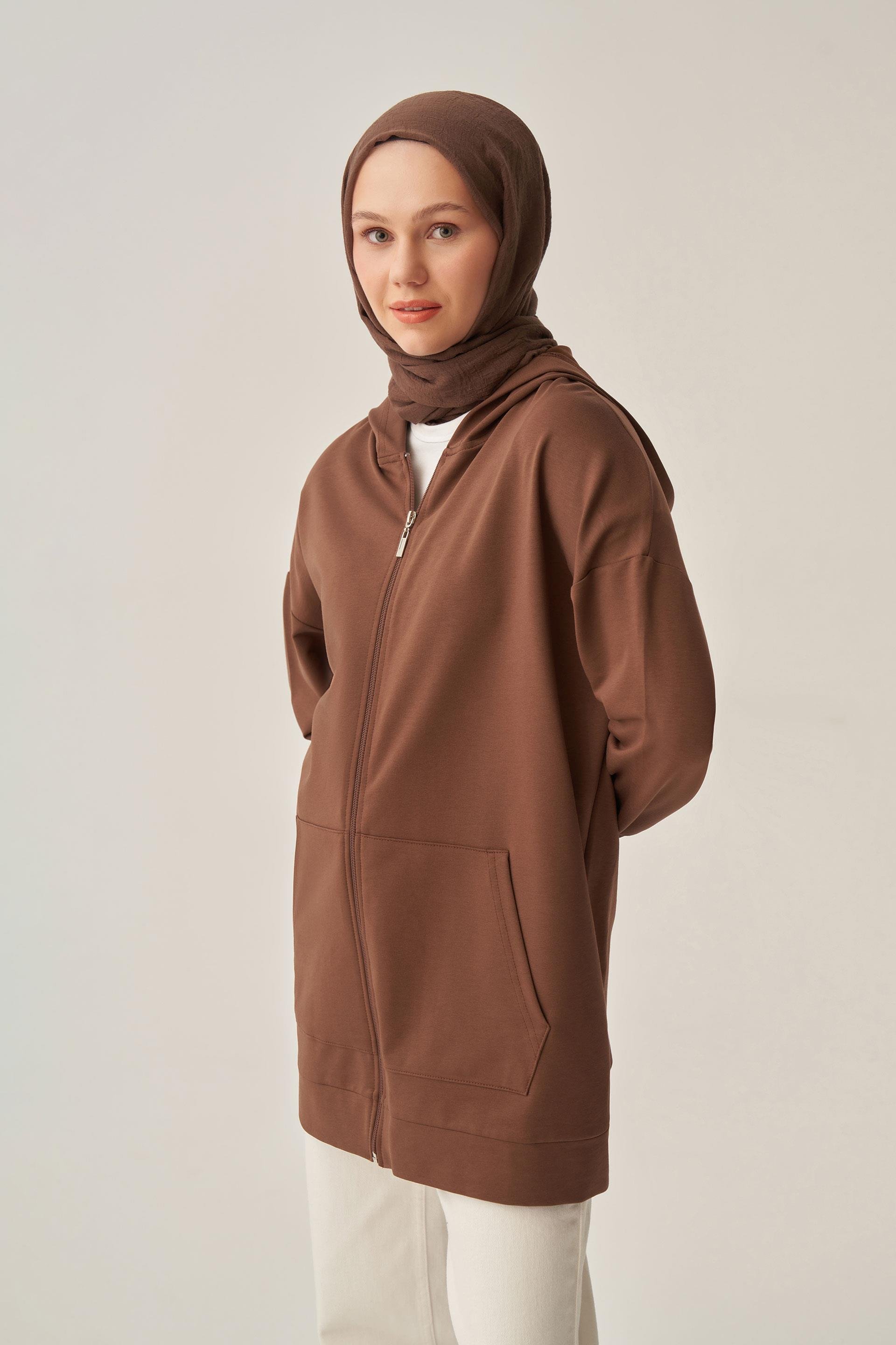 Kahve-Kapüşonlu Fermuarlı Likralı Sweat Hırka