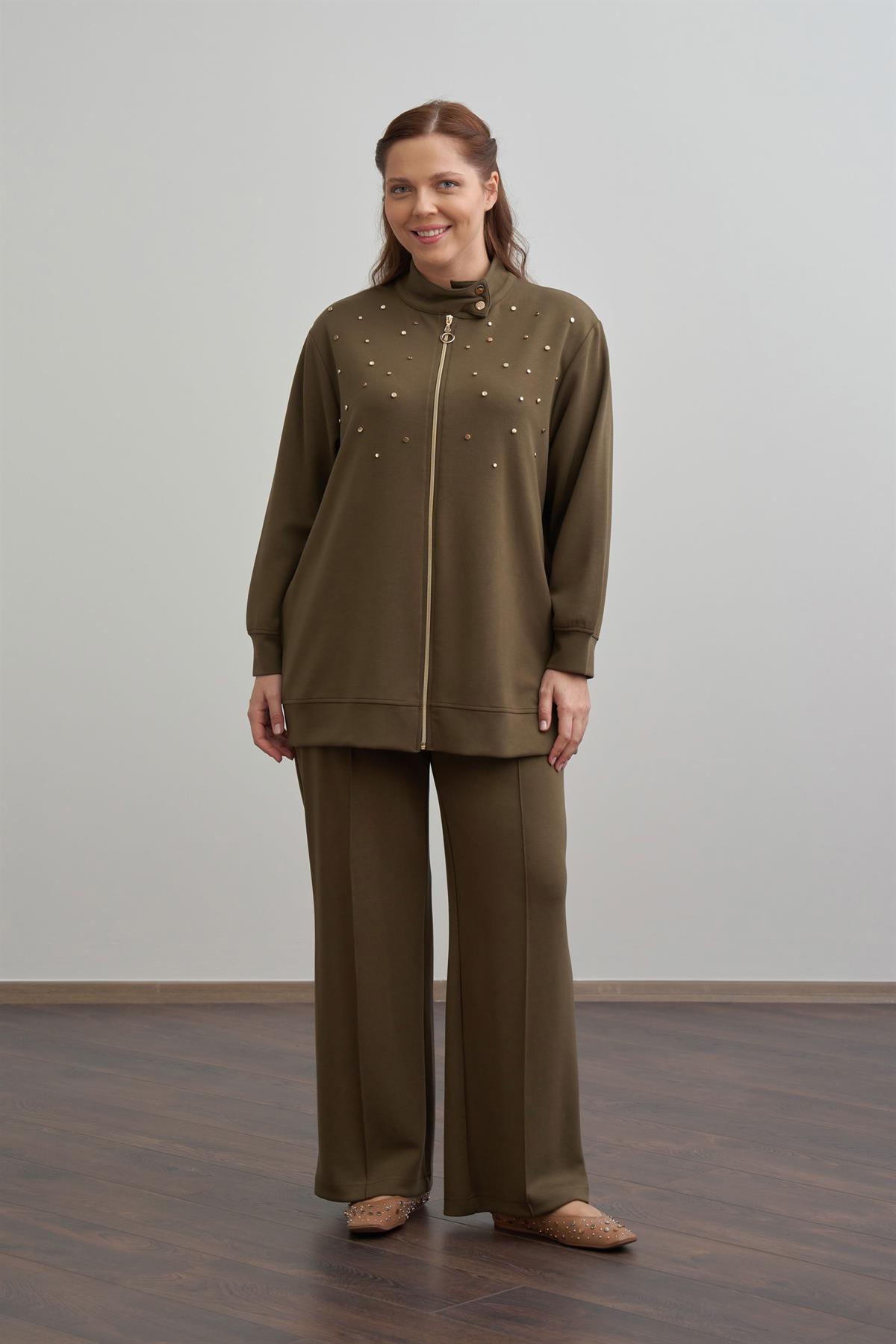 Haki-Yumuşak Dokulu Büyük Beden Droplu Eşofman Takımı
