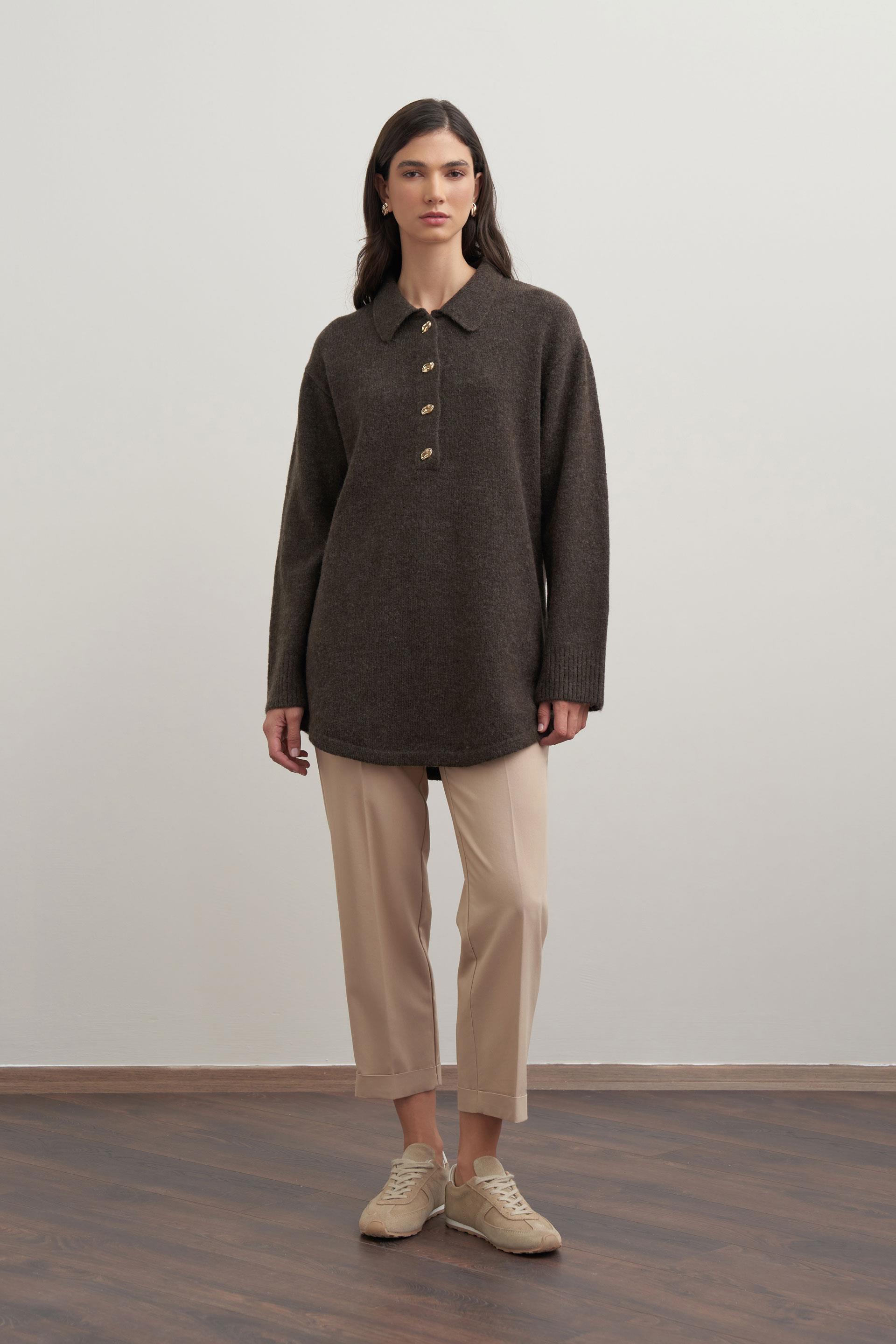 Kahve-Gold Dügmeli Yarım Patlı Kazak (W94039A0)