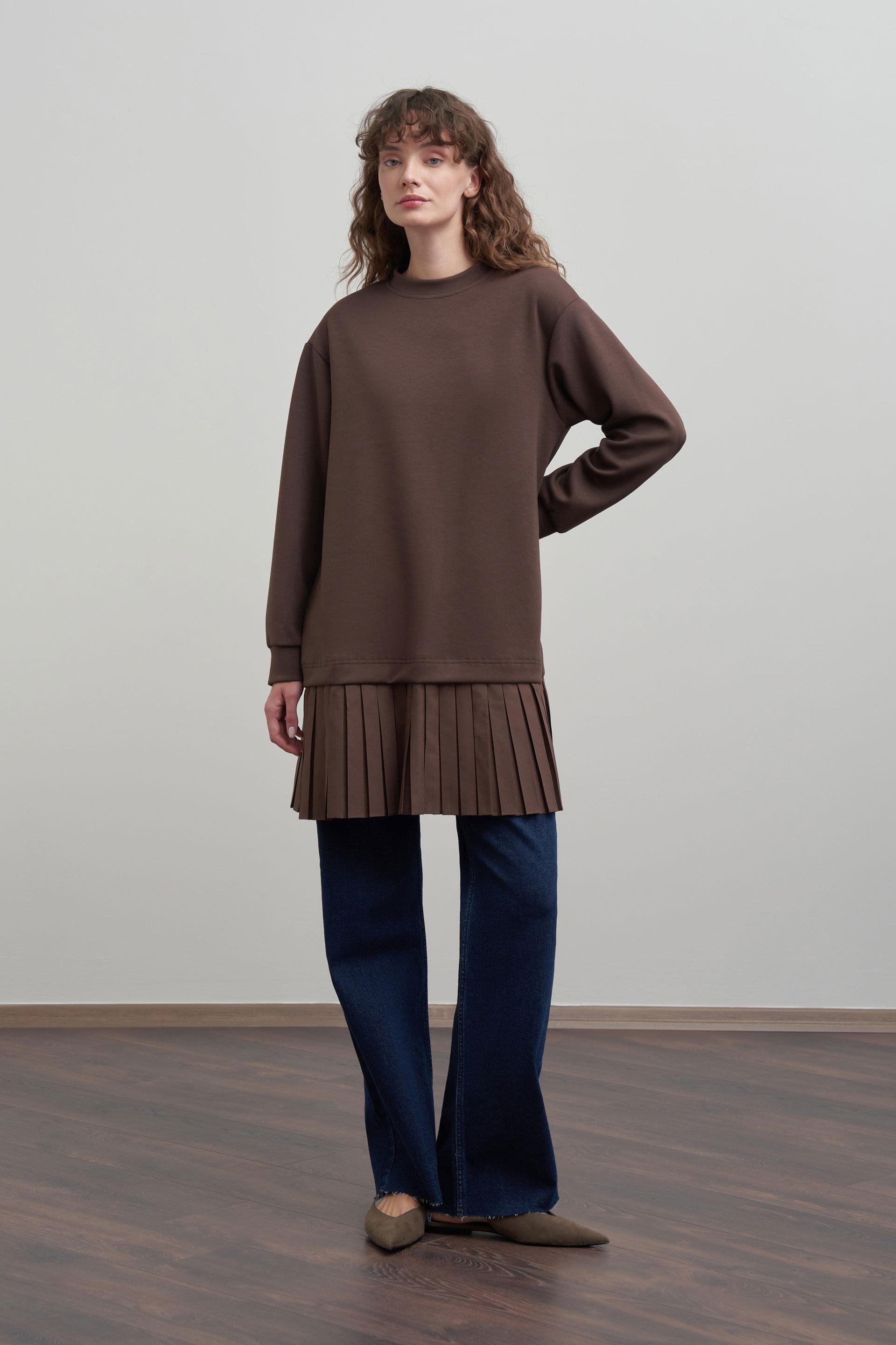 Kahve-Yumuşak Dokulu Pliseli Detaylı Tunik