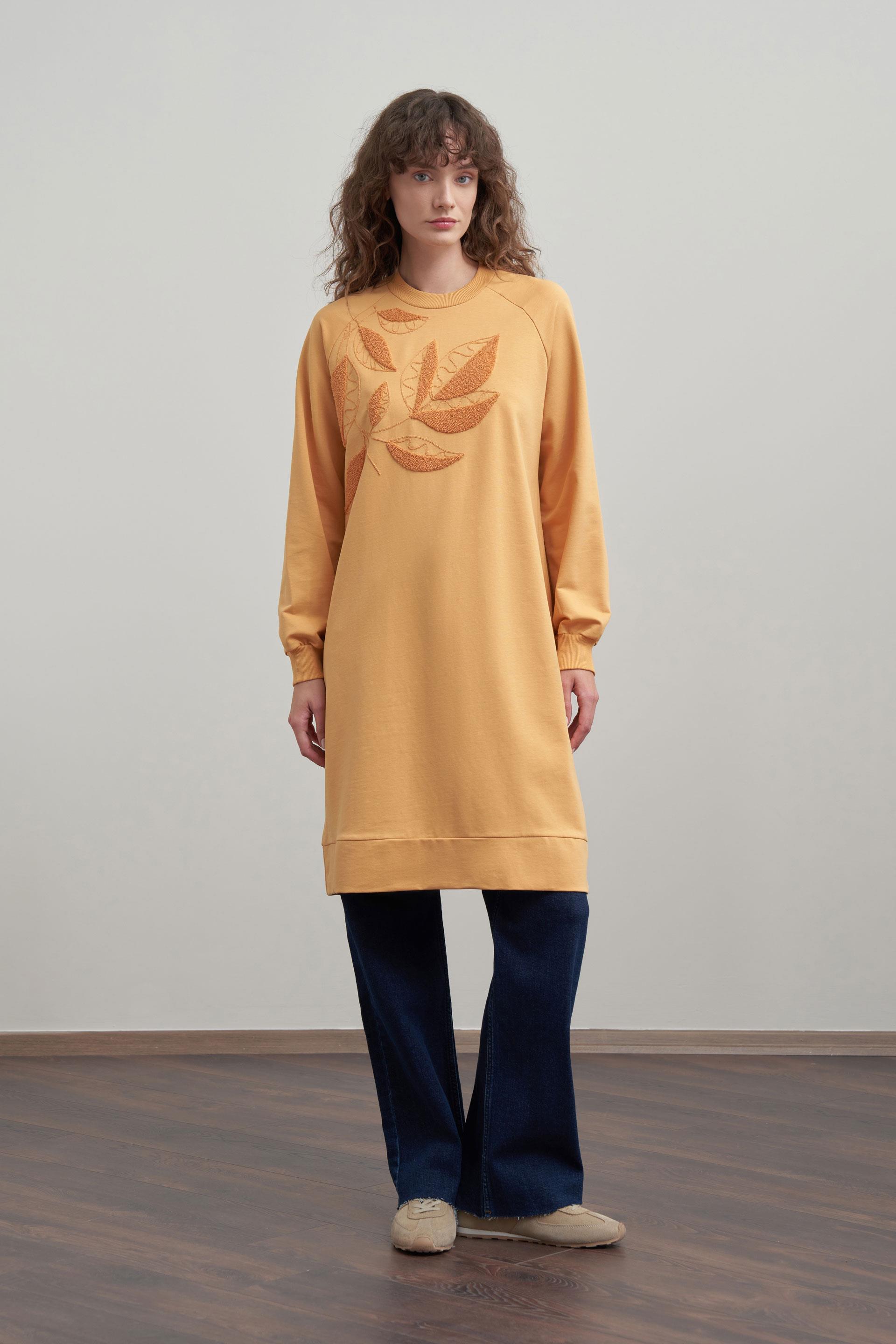 Kirli Sarı-Pamuklu Yaprak Desenli Tunik