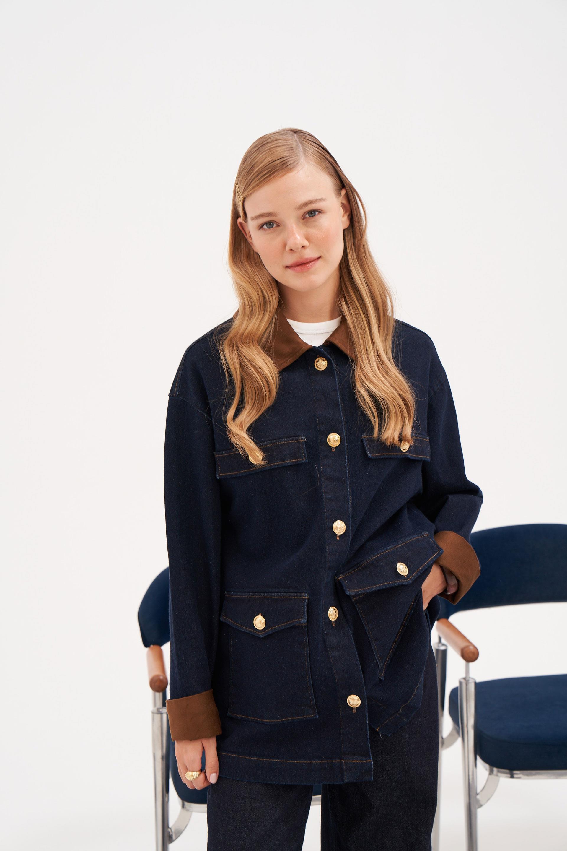 Koyu Mavi-Süet Garnili Denim Ceket