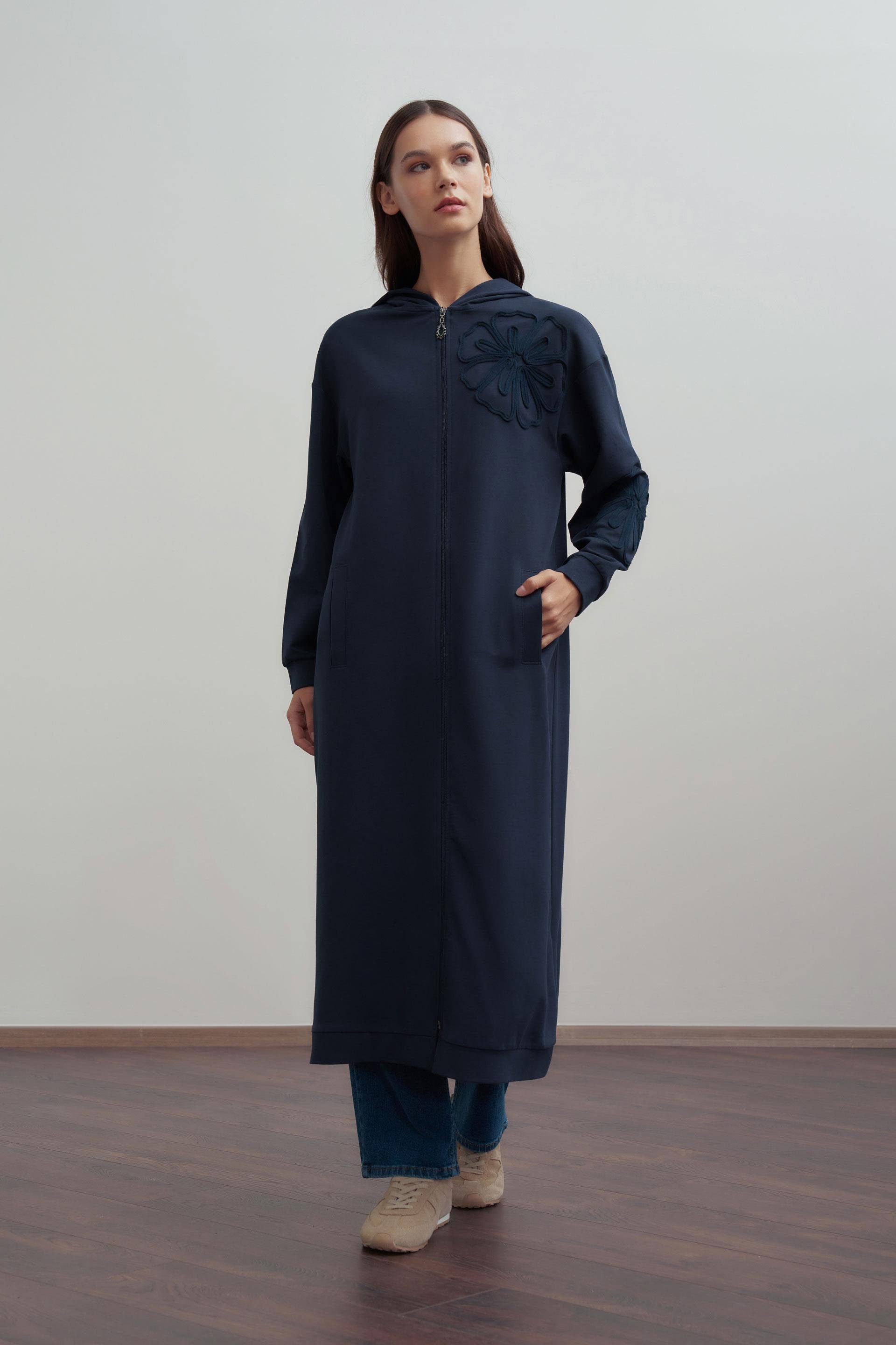 Lacivert-Pamuklu Nakışlı Fermuarlı Sweat Hırka