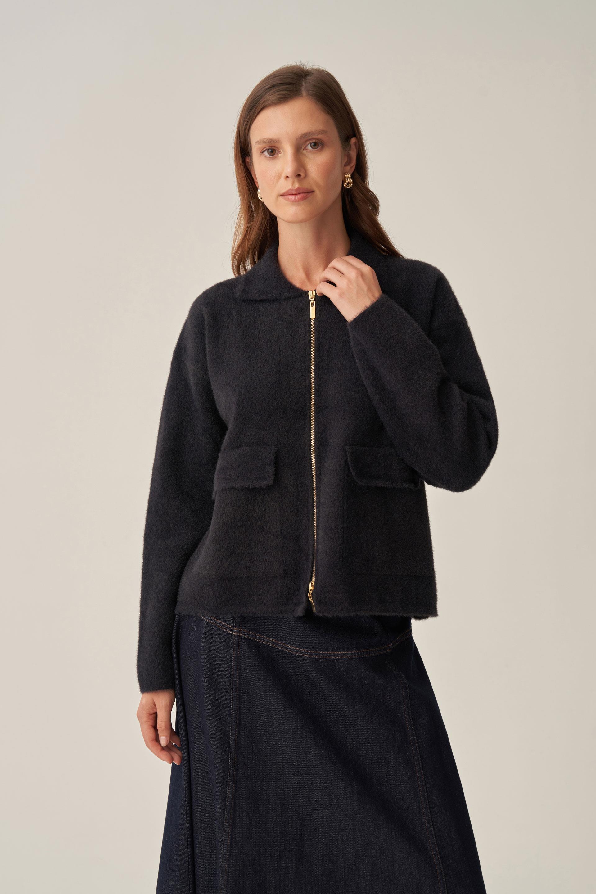 Siyah-Kapak Cepli Fermuarlı Peluş Hırka