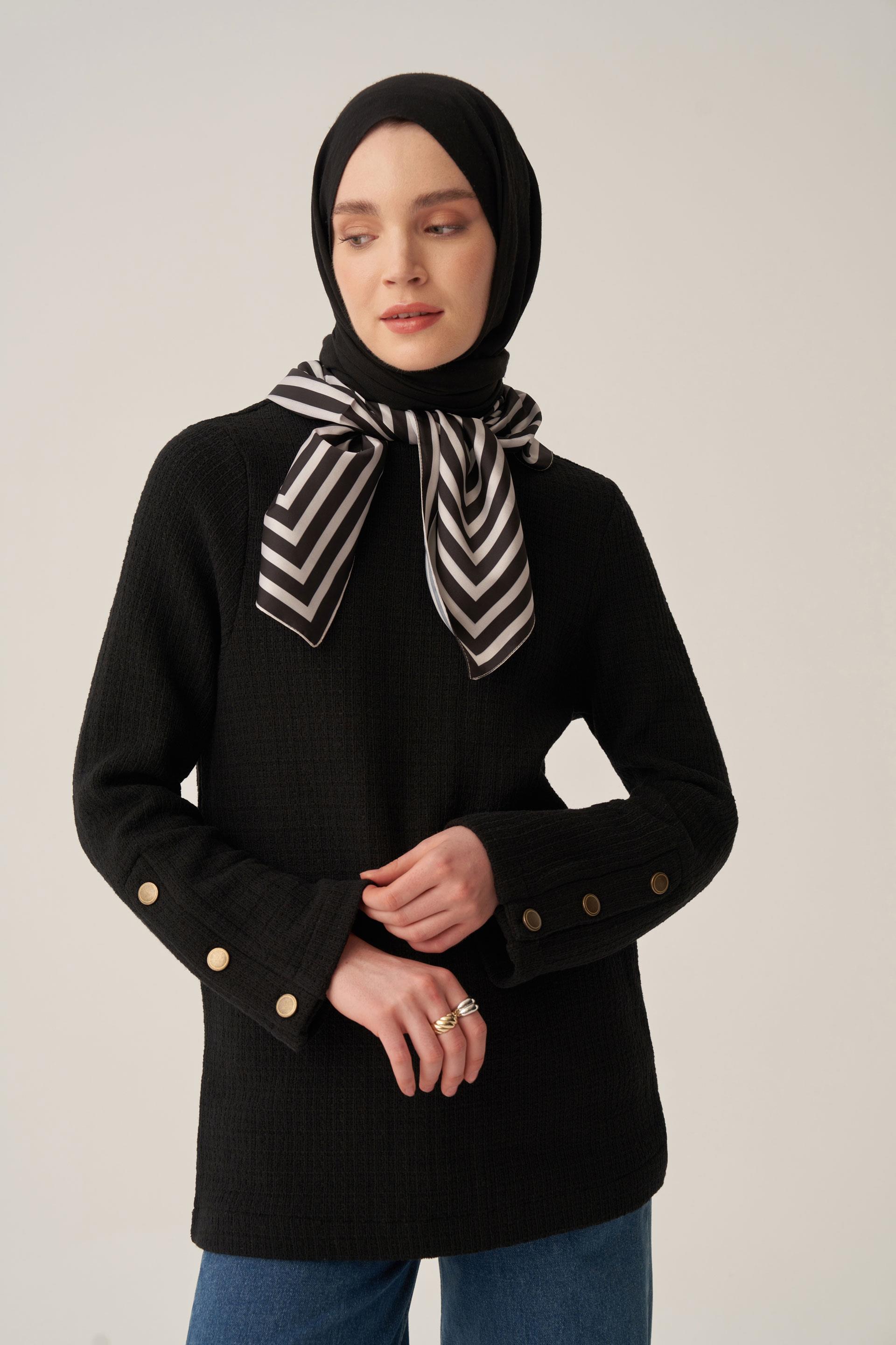 Şıklığı detaylarda arayanlara özel Siyah-Triko Efektli Bluz ile zarif bir görünüm yakalayın. Günlük ve özel kombinler için ideal tasarım ALLDAY’de!