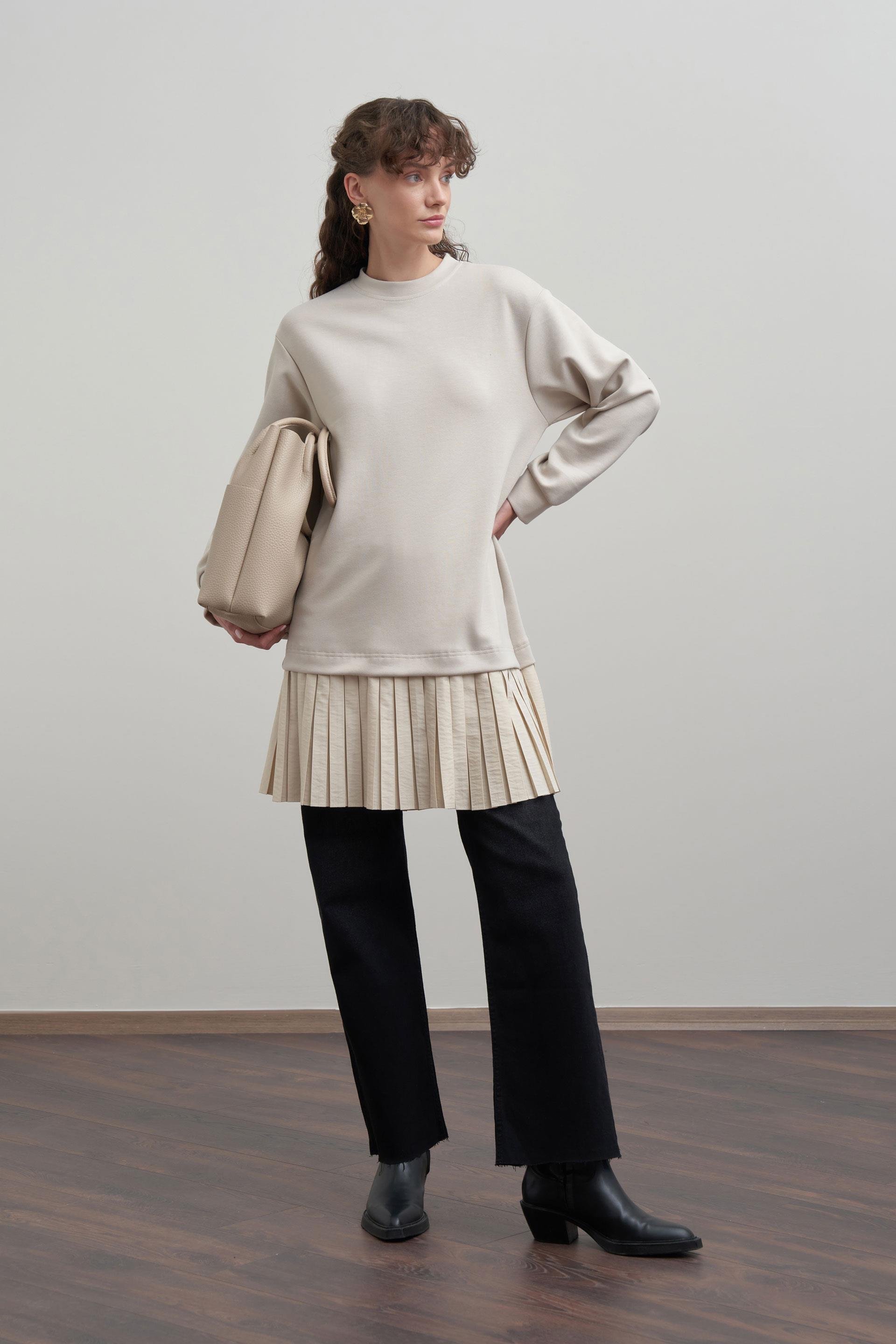Taş-Yumuşak Dokulu Pliseli Detaylı Tunik